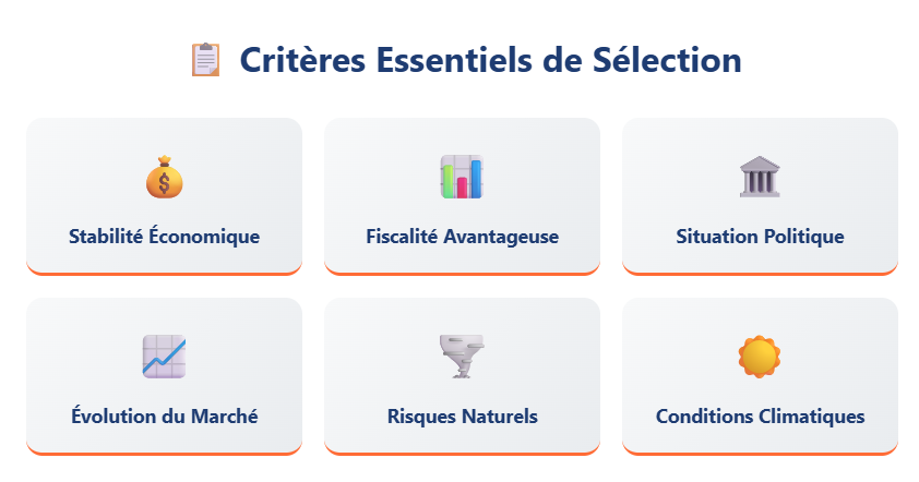 De nombreux critères sont à prendre en compte pour choisir un pays dans lequel réaliser un investissement immobilier. Ces critères sont essentiels pour trouver le pays qui correspond à vos besoins et qui correspond à votre stratégie d'investissement. Parmi les critères à prendre en compte lors d'un investissement, citons :