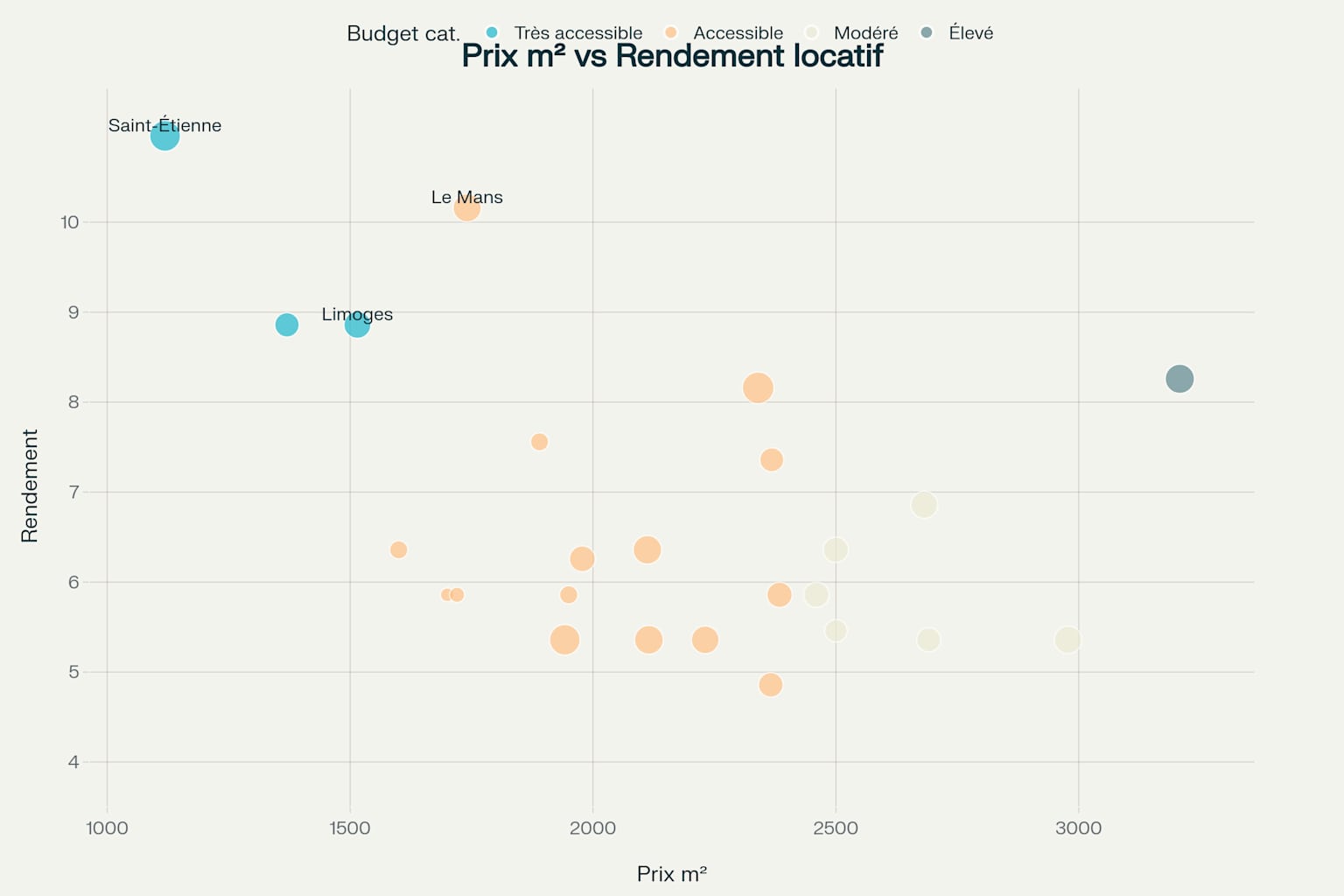 Le graphique révèle une corrélation inverse entre prix au m² et rentabilité locative. Les villes les plus accessibles (Saint-Étienne, Limoges, Mulhouse) offrent les meilleurs rendements, tandis que les villes plus chères comme Angers maintiennent une rentabilité correcte grâce à leur dynamisme économique.