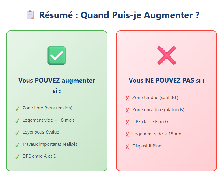 Exceptions permettant l'augmentation : loyer sous-évalué, travaux importants (≥50% du loyer annuel), ou logement vacant >18 mois