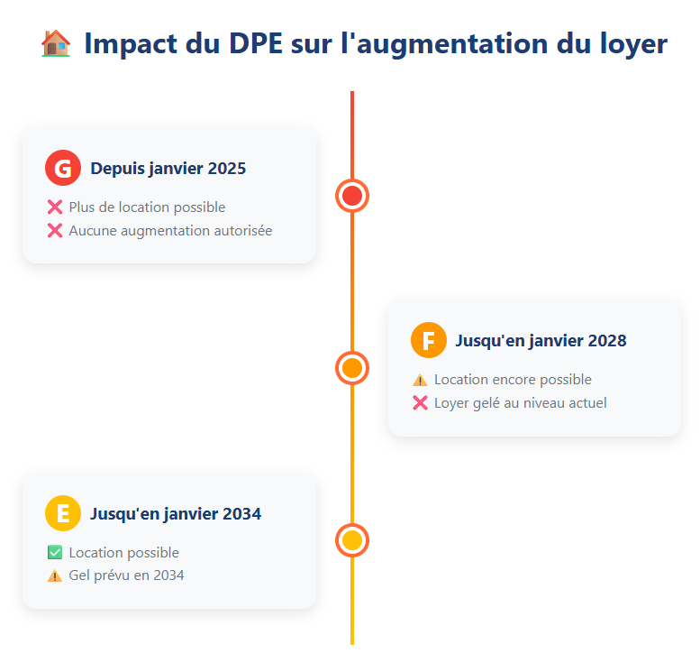 Depuis le 1er janvier 2025, tous les logements classés G ne peuvent plus être remis en location. Ce sera le cas des logements classés F au 1er janvier 2028 (puis des logements avec un DPE E au 1er janvier 2034). Selon l'article 159 de la loi du 22 août 2021, les bailleurs sont contraints de conserver le loyer appliqué au précédent locataire pour un logement classé G ou F.