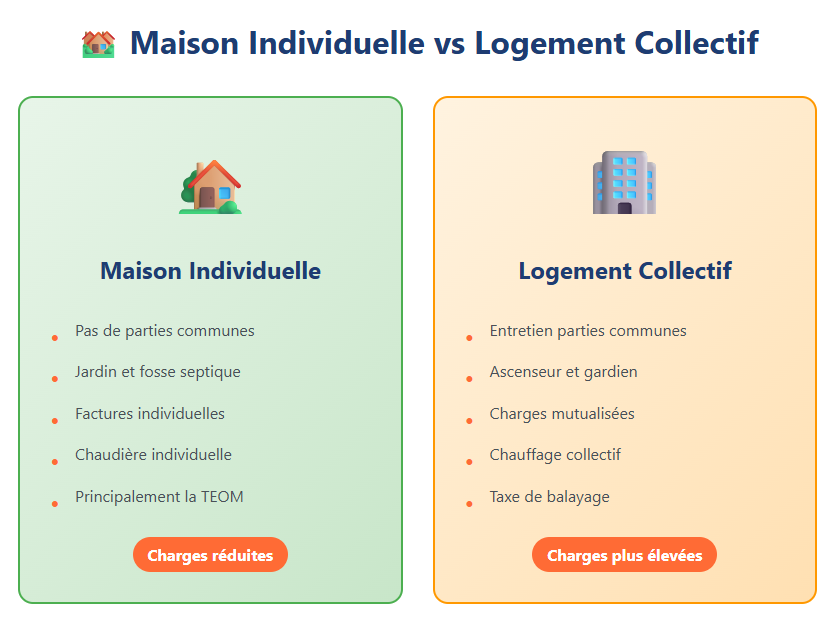 Charges liées à l’entretien | Jardin, fosse septique, chaudière individuelle | Ascenseur, nettoyage des parties communes, espaces verts collectifs |